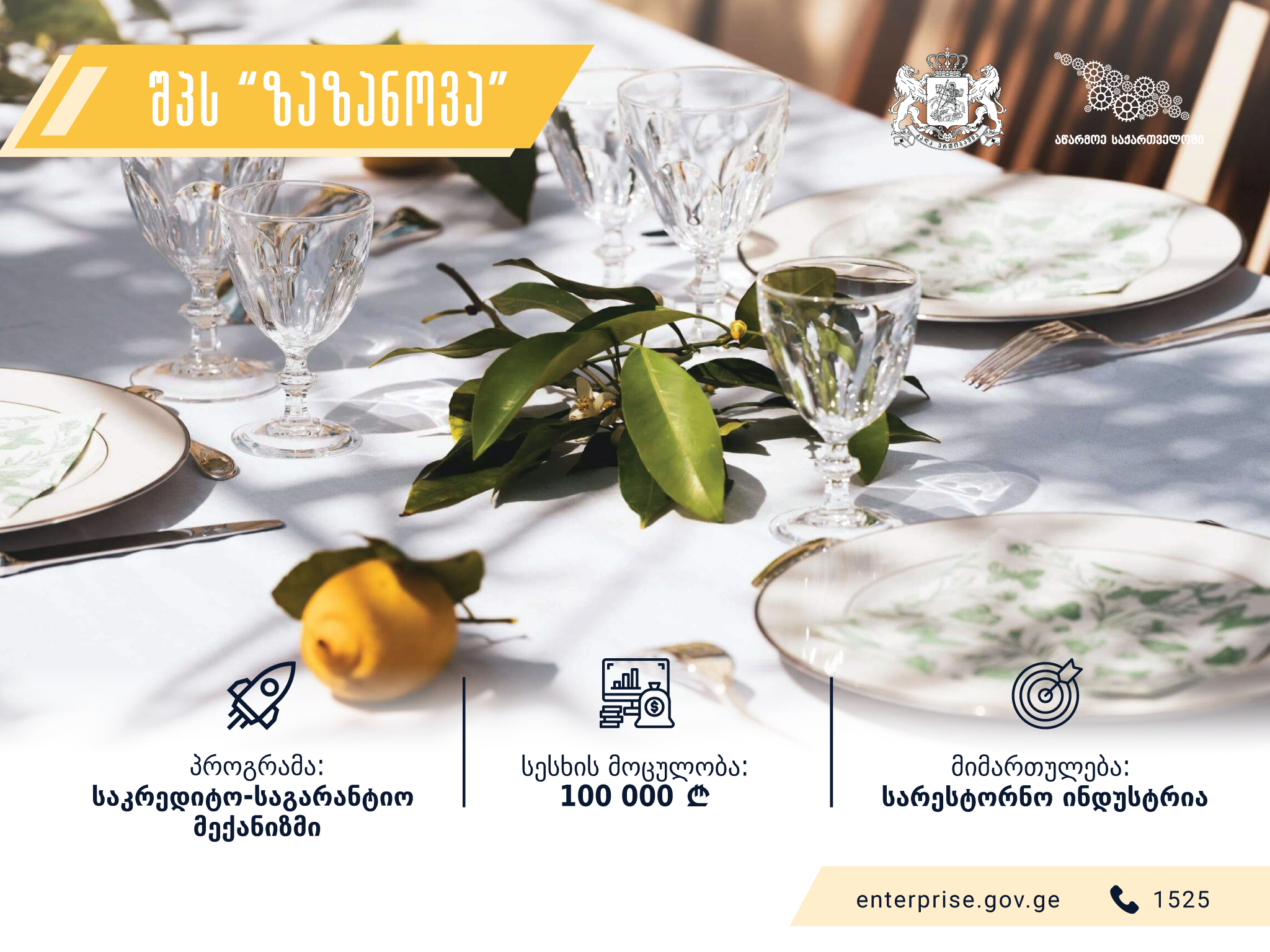 რესტორანი „ზაზანოვა“ აღნიშნული პროგრამის ფარგლებში გაფართოებას შეძლებს და სტუმრებს ახალ სივრცეში უმასპინძლებს. კომპანიამ 100 000 ლარის სესხი აიღო, რომლის ძირი თანხის 90%-ის გარანტორი სახელმწიფო იქნება.