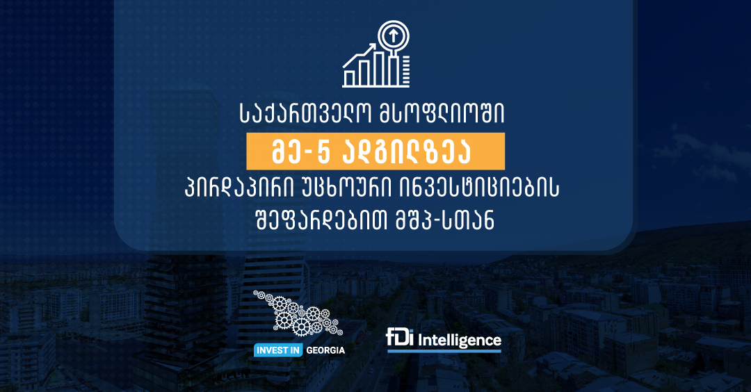 მთლიან შიდა პროდუქტთან მიმართებით, პირდაპირი უცხოური ინვესტიციების საუკეთესო მაჩვენებლების მქონე მსოფლიოს 76 ქვეყანას შორის საქართველო ტოპ ხუთეულშია.